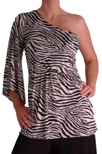• Asymmetric Off the Shoulder Zebra Print Top. Wide Neckline. Long Sleeves.